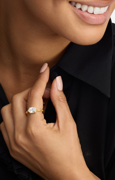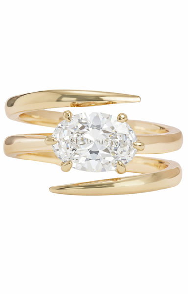 A fresh take on a classic. An oval solitaire set east to west and framed by a sculptural lasso wrap, creating a look that feels both timeless and d...