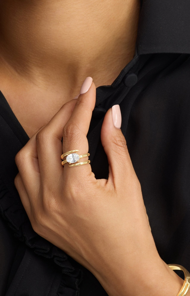 Designed to hug with impact. A sculptural lasso wrap curves around the ear, anchored by an oval solitaire that catches the light with every turn. L...