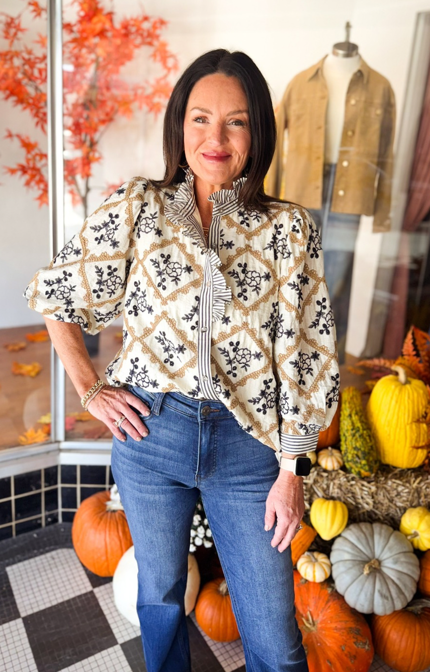 Dawn is wearing size S Fit is true to size Dawn’s tts is S/M Relaxed fit Embroidered floral design Ruffled neckline Button front & cuffs 3/4 s...