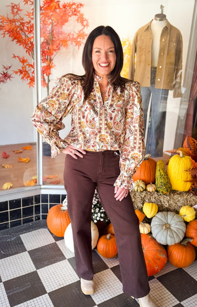 Dawn is wearing size S Fit is true to size Dawn’s tts is S/M Relaxed fit Paisley print Puff sleeve Ruffled band collar Buttoned cuffs w/ ruffles U...