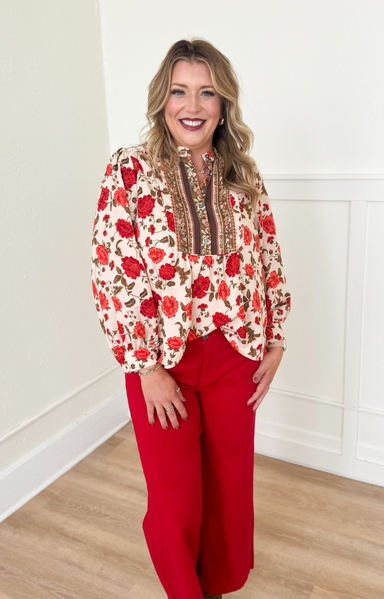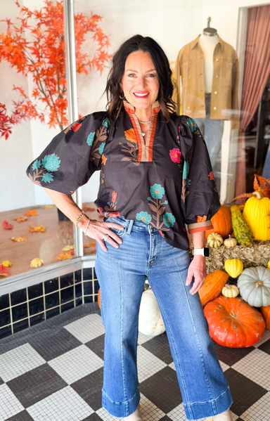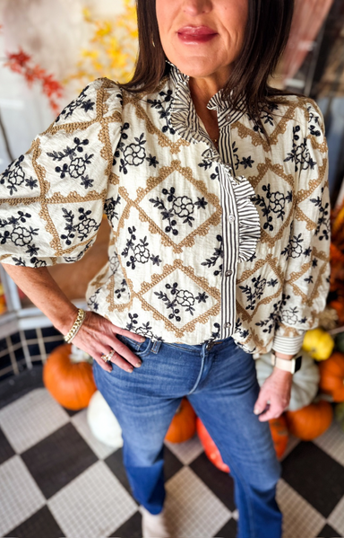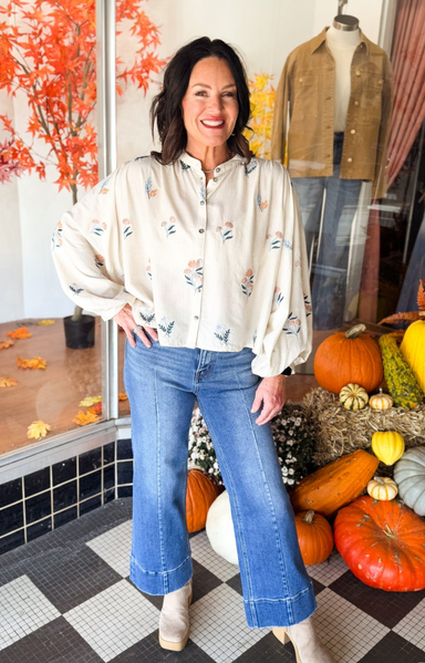 Dawn is wearing size S Fit is true to size Dawn’s tts is S/M Relaxed fit Embroidered floral design Ruffled neckline Button front & cuffs 3/4 s...