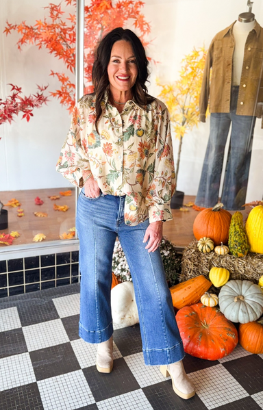 Dawn is wearing size S Fit is true to size Dawn’s tts is S/M Relaxed fit Floral print 3/4 sleeve Button front 7 cuffs Drop shoulders Lined, non-sh...