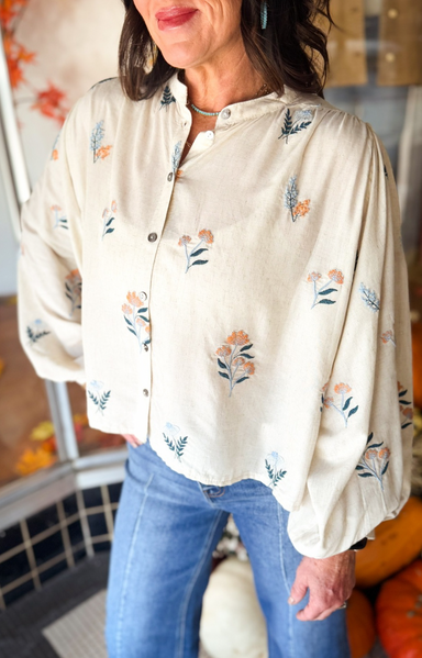 Dawn is wearing size S Fit is true to size Dawn’s tts is S/M Relaxed fit Floral embroidered design Button front Puff sleeve Unlined, non-sheer 40...