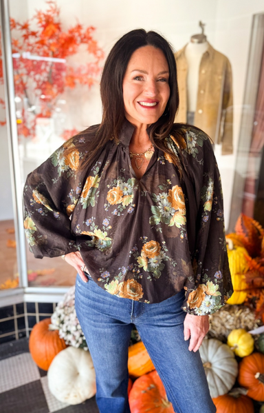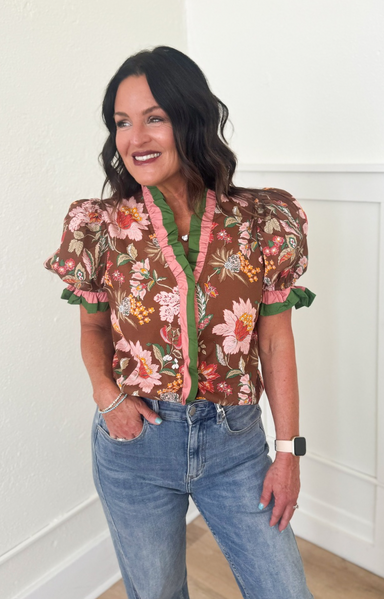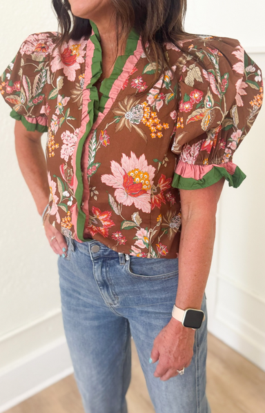 Dawn is wearing size S Fit is true to size Dawn’s tts is S/M Relaxed fit Floral print 3/4 puff sleeve Contrast trim neck & cuffs Unlined, non-...