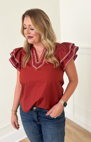 Shawna is wearing size L Fit is true is true to size Shawna’s tts is L Relaxed fit Ruffle flutter sleeve V-neck Contrast embroidered trim Unlined,...