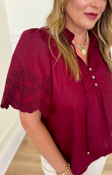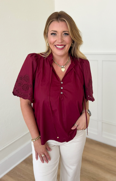 Shawna is wearing size L Fit is true to size Shawna’s tts is L Regular fit Optional tie at neck Ruffled neckline Eyelet, embroidered flare sleeve ...