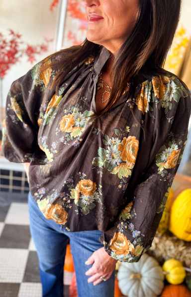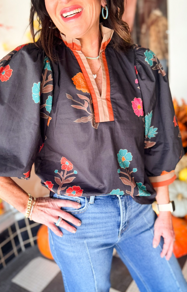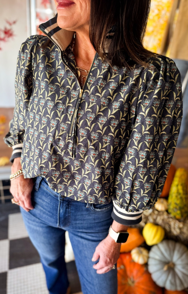 Dawn is wearing size S Fit is true to size Dawn’s tts is S/M Relaxed fit Floral print 3/4 puff sleeve Half zip closure Contrast stripe collar &...