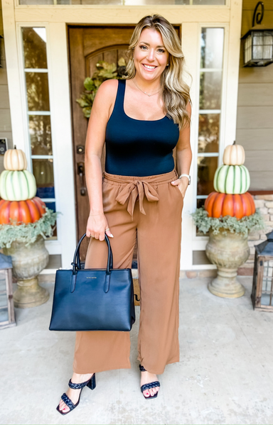 Shawna is wearing size L Fit is true to size Shawna’s tts is L Wide leg High rise Full length Unlined Elastic waistband Side pockets Contrast stri...