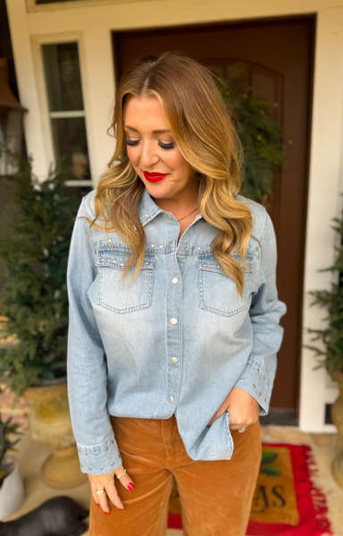 Shawna is wearing size L Fit is true to size Shawna’s tts is L Regular fit Western style Stud detailing Flap chest pockets Button front closure