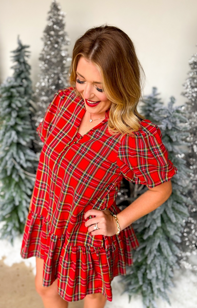 Shawna is wearing size L Fit is true to size Shawna’s tts is L Regular fit Plaid print Bubble sleeves Ruffle hem Antique gold accent buttons V-nec...