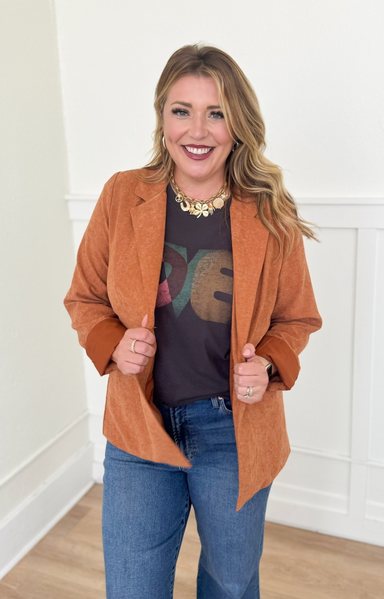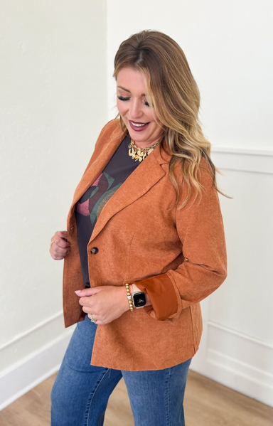 Shawna is wearing size L Fit is true to size Shawna’s tts is L Relaxed fit Single-button front Tailored silhouette Front flap pockets Velvety, so...