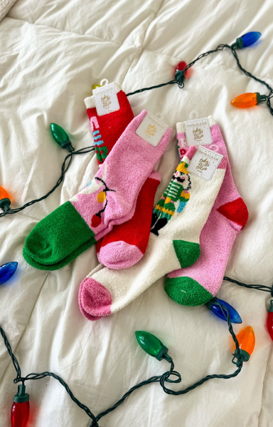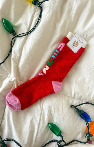 Fuzzy socks ‘Merry & Bright’ across the top Made from polyester and spandex