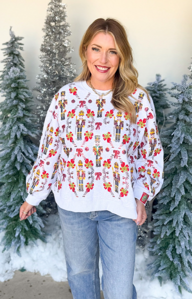 Shawna is wearing size L for a more oversized look Size down one for best fit Shawna’s tts is L Oversized, relaxed fit Sequined nutcracker on fron...