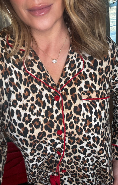 Shawna is wearing size L Fit is true to size Shawna’s tts is L Regular fit Modal jersey All over leopard print Button front top Red piping details...