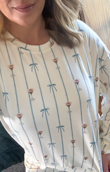Shawna is wearing size L Fit is true to size Shawna’s tts is L Relaxed fit Soft, silky jersey fabric All over espresso martini and bows print Crew...
