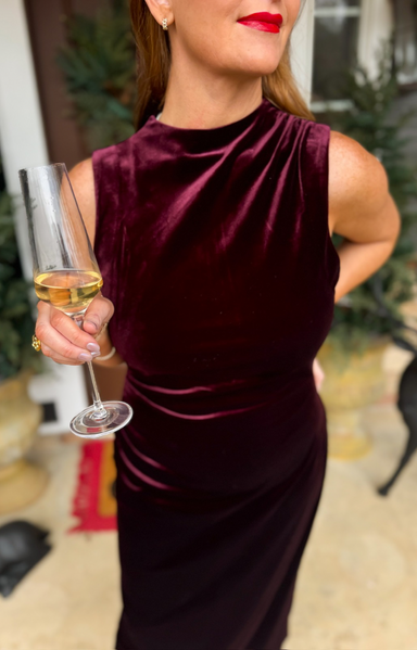 Megan is wearing size M Fit is true is true to size Megan’s tts is S/M Regular fit Velvet finish Funnel neck Side ruching Back slit Hidden back-zi...