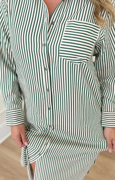 Shawna is wearing size L Fit is true to size Shawna’s tts is L Relaxed fit Stripe pattern Chest & side pockets Midi length Rounded slit hem Un...