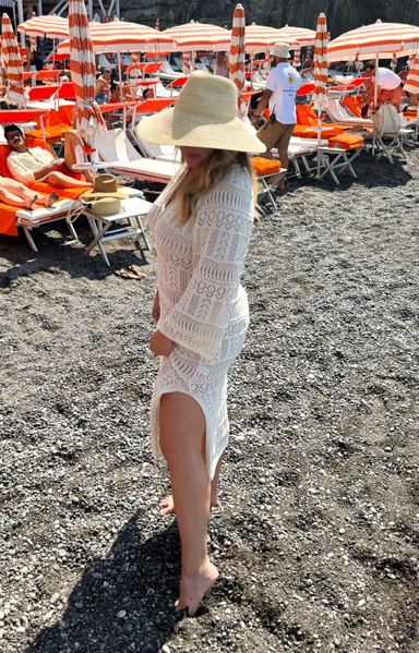 Shawna is wearing size L Fit is true to size Shawna’s tts is L Relaxed fit Crochet design Deep v-neck w/ tie Side slits 70% polyester, 30% cotton