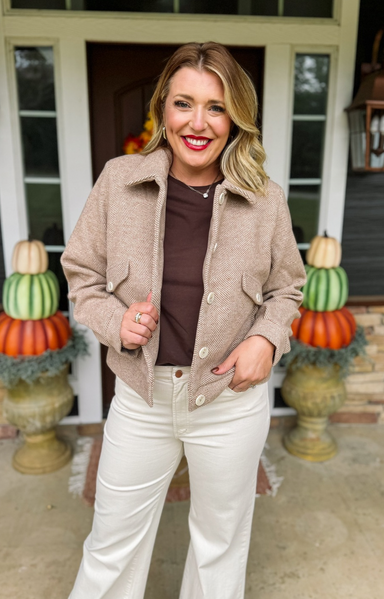 Nicole is wearing size L Size up one for best fit Nicoles’s tts is M Fitted Cropped Drawstring, toggle hem Button & zip front closure Side zip...