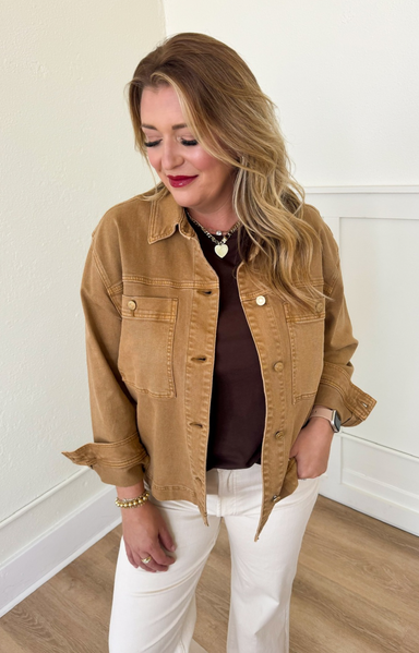 Shawna is wearing size M Size down one for best fit Shawna’s tts is L Oversized fit Soft heathered fabric Notch collar Button front Side seam pock...