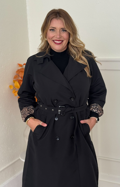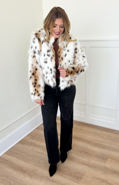 Shawna is wearing size L Fit is true to size Shawna’s tts is L Regular fit Leopard faux fur Wide shawl collar Boxy Fully lined Snap button closur...