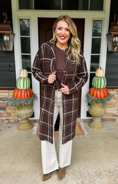Shawna is wearing size M Size down one for best fit Shawna’s tts is L Relaxed fit Fuzzy Button front closure Hip length 100% polyester