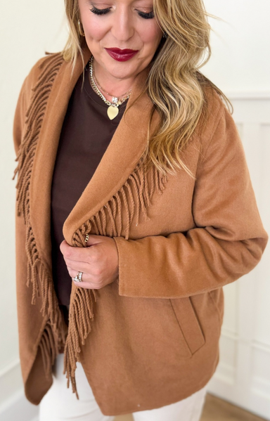 Shawna is wearing size L Fit is true to size Shawna’s tts is L Regular fit Shawl lapel Fringe detailing Blazer-inspired 100% polyester