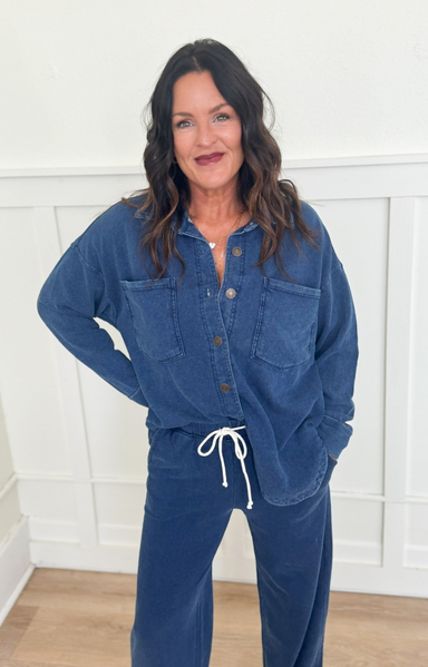 Dawn is wearing size S Fit is true to size Dawn’s tts is S/M Regular, classic fit Button front Chest & side pockets 98% cotton, 2% spandex