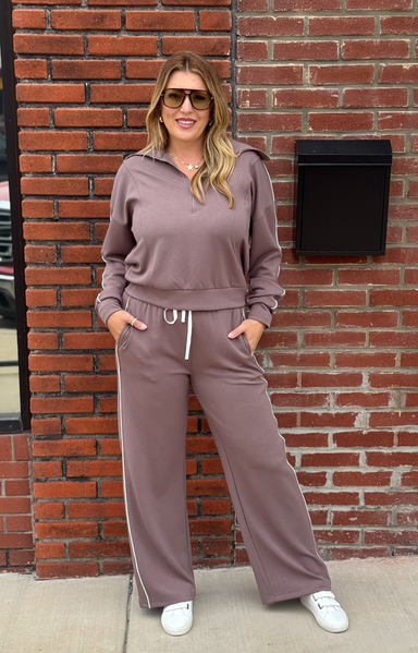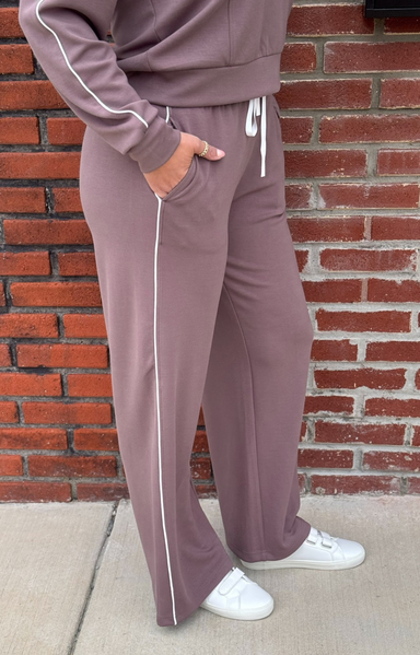 Shawna is wearing size L Fit is true to size Shawna’s tts is L Relaxed fit Track lounge pants Contrast piping Elastic waistband w/ drawstring Sid...