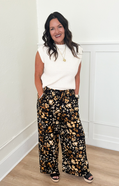 Dawn is wearing size S Fit is true to size Dawn’s tts is S/M Regular fit Floral print Wide leg Drawstring, elastic waistband Side pockets 100% rayon