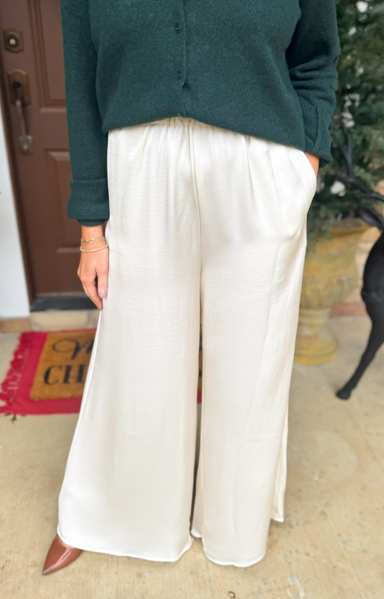Megan is wearing size M Fit is true is true to size Megan’s tts is S/M Relaxed fit Satin finish Elastic waistband Side pockets Wide leg 100% polye...