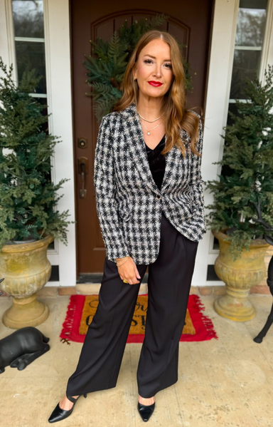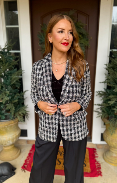 Megan is wearing size XS Fit is true is true to size, but size down one for a more fitted look Megan’s tts is S/M Regular fit Structured tweed Fro...