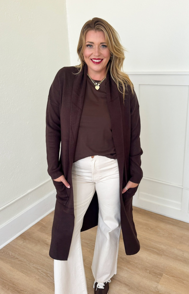 Shawna is wearing size M Size down one for best fit Shawna’s tts is L Relaxed fit Maxi cardigan Shawl lapel collar Front patch pockets Open front ...