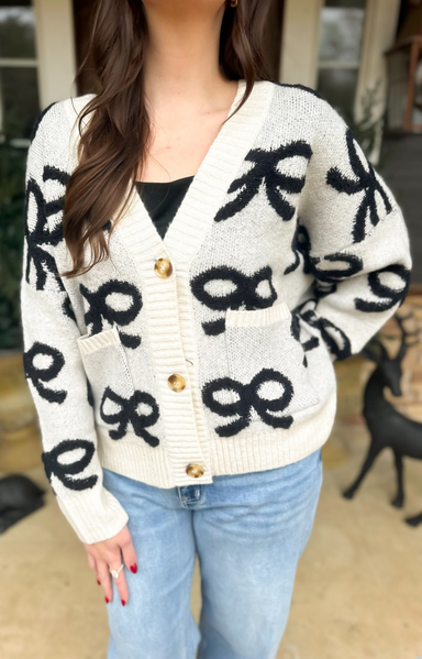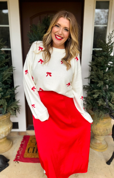 Shawna is wearing size L Fit is true to size Shawna’s tts is L Relaxed fit Crewneck Delicate bow embroidery all over Cozy spring yarns 44% acrylic...